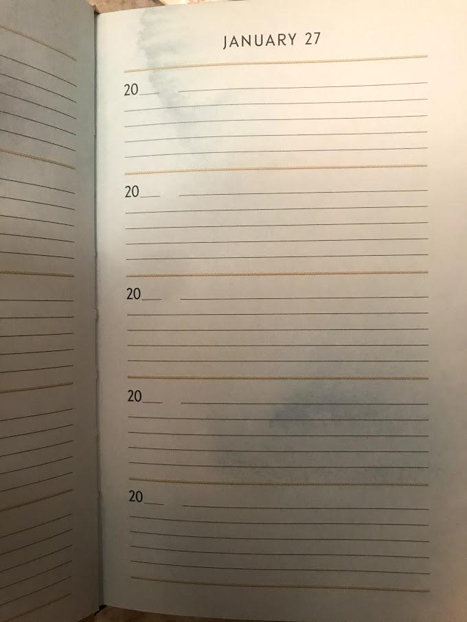 The pages of the journal are not blank; instead, each section lists a date at the top (beginning with January 1 and continuing all the way to New Year’s Eve, December 31). The pages are divided into five sections, containing a space to write in the current year and a few lines.